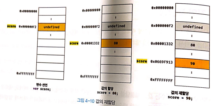 -> 그림처럼 변수에 값을 할당할 때는 이전 값 undefined가 저장되어 있던 메모리 공간을 지우고 그 공간에 값을 저장하는 것이 아니라 새로운 메모리 공간을 확보하고 그곳에 할당 값을 저장한다.