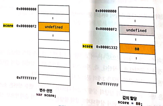 -> 변수 선언 후 값을 할당하지 않았지만 확보된 메모리 공간은 비어있지 않고 자바스크립트 엔진에 의해 undefined라는 값이 암묵적으로 할당되어 초기화된다.