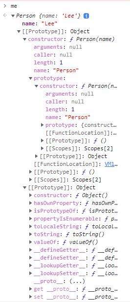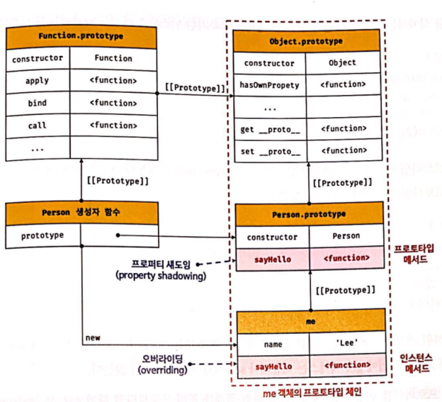 생성자 함수가 생성한 인스턴스는 자신의 프로토타입 체인에 속한 객체의 프로퍼티/메서드에 접근할 수 있지만